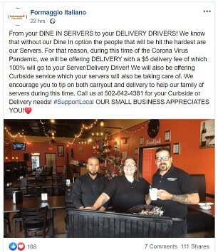For example, look at this announcement made by Formaggio Italiano restaurant that has decided to support their staff by offering the $5 delivery option to cover the salary of servers who temporarily take on the roles of delivery drivers.